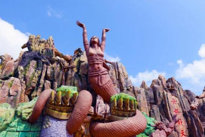 大型主题项目《女娲补天》为室内车载式轨道项目,项目选取了上古神话中关于女娲的经典传说为表现内容,游客将乘坐方舟跟随女娲冲出天机阁,迎战祝融、共工,坠入魔窟,最终夺取五彩石,飞跃不周山,经历一场助女娲炼石补天拯救苍生的历险之旅。